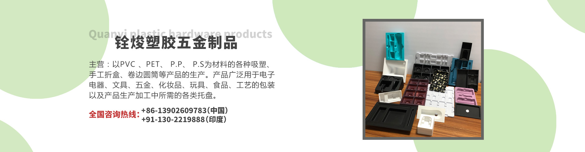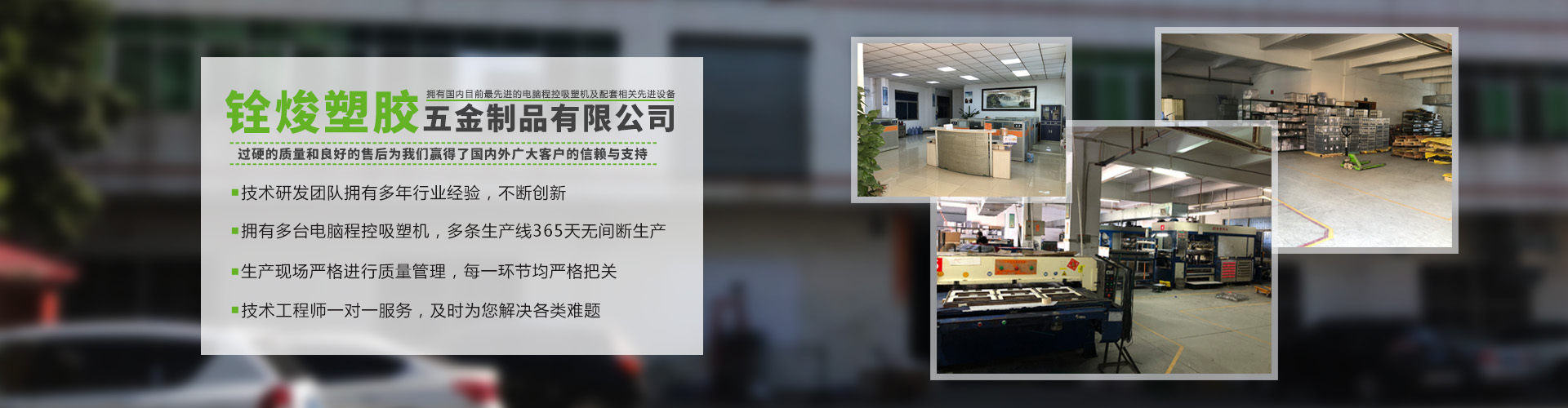 铨焌塑胶五金制品有限公司位于东莞市东城区温塘横岭二街8号,公司创始于2010年,并于2018年在印度成立子公司(盈灿环保包装科技有限公司)。我司是一家集开发、设计、生产、销售为一体的专业生产吸塑包装的企业。致力于以PVC 、PET、 P.P、 P.S为材料的各种吸塑、手工折盒、卷边圆筒等产品的生产。产品广泛用于电子电器、文具、五金、化妆品、玩具、食品、工艺的包装以及产品生产加工中所需的各类托盘。 在公司全体人员的共同努力下,产品遍迹整个珠三角,深受客户好评,并得到了同行业人士的认可。